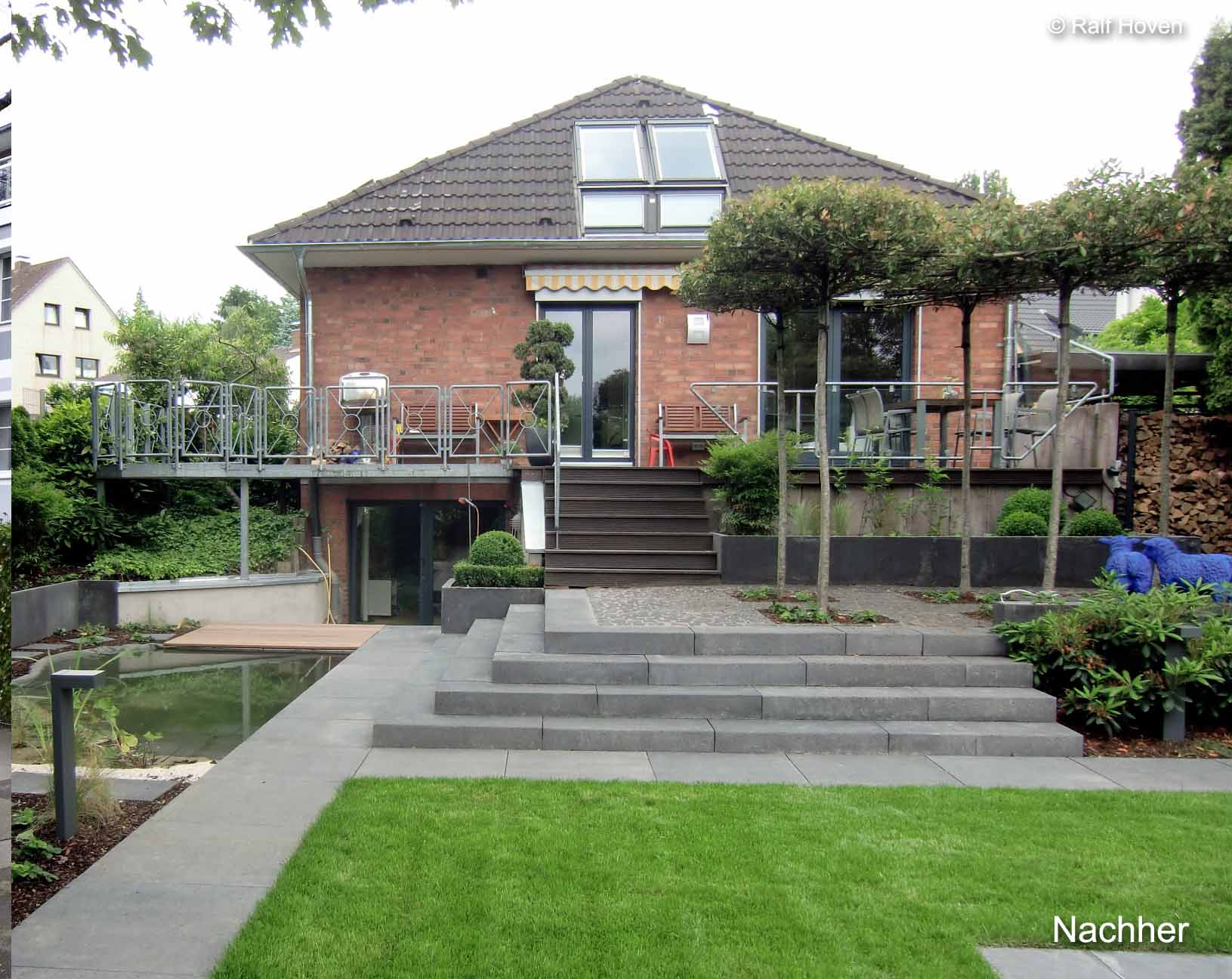 Diesen Garten mit altem Baumbestand haben wir grundlegend neu geplant (siehe Gartenplanung Frechen-Königssdorf) und umgebaut. Entstanden ist ein vielfältiger Freiraum mit spannenden Kontrasten. Es gibt ein baumbestandenes Plateau, eine großzügige Treppenanlage, ein geometrisches Wasserbecken, einen naturnahen Teich, Spielrasen, ein Gartenhaus und Staudenbeete.