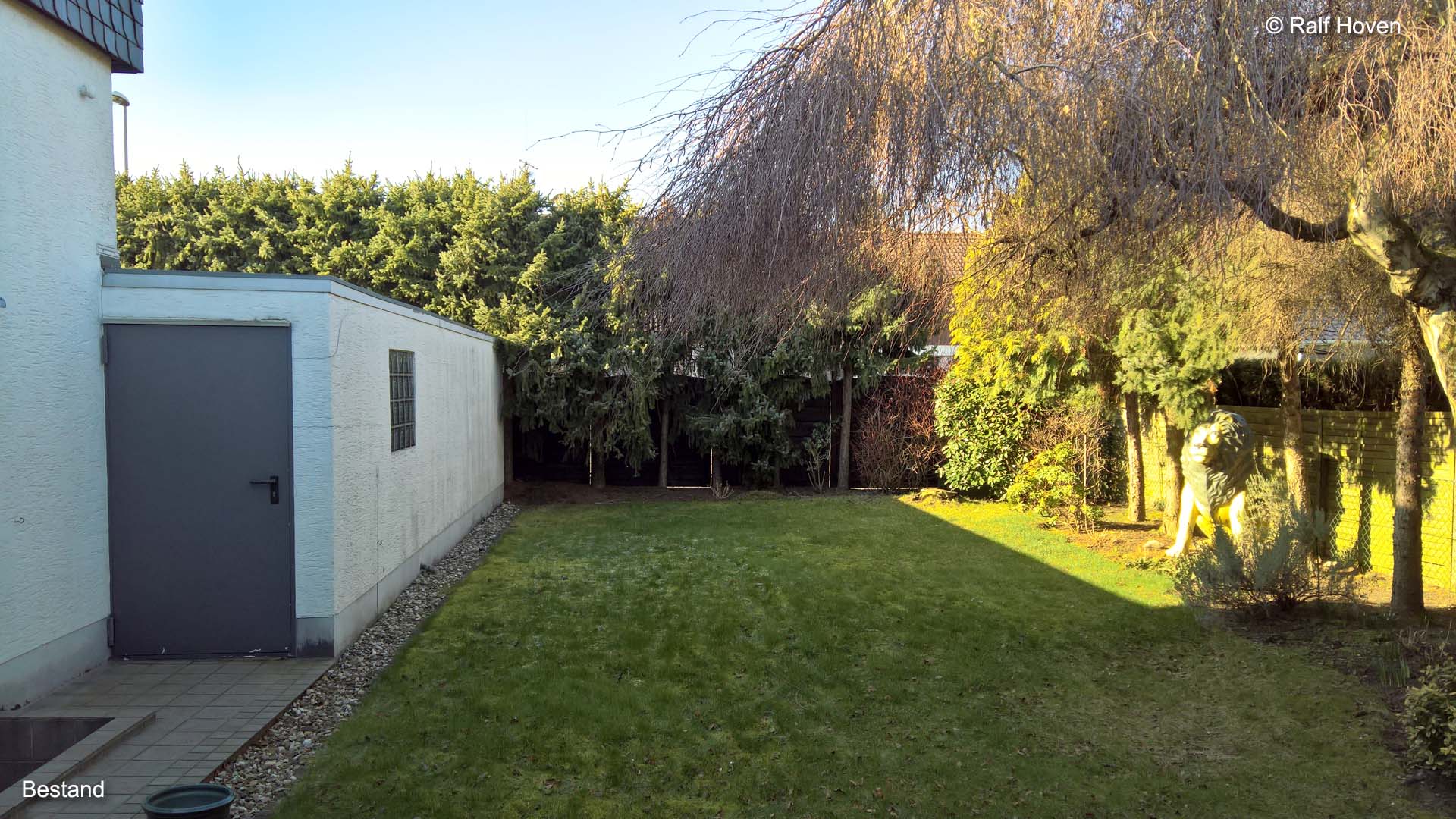 Unser Konzept zur Umwandlung eines in die Jahre gekommenen Gartens in einen modernen Innenhofgarten. Die Einfriedung mit einem Betonzaun ist pflegeleicht und verleiht