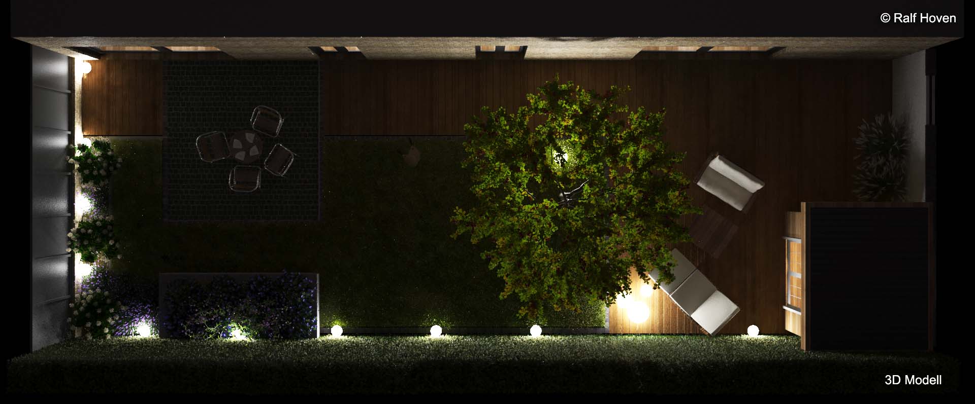 Gleichzeitig werden die Staudenbeete und der prächtige Apfelbaum als gezielte Akzente hervorgehoben. Dezente Bodenleuchten oder Spots setzen die Blüten und Formen der