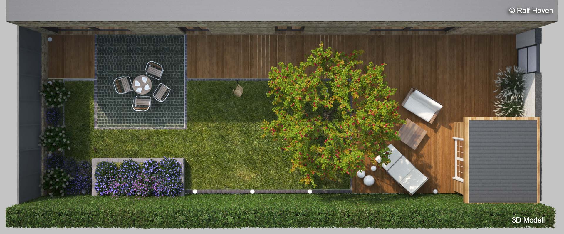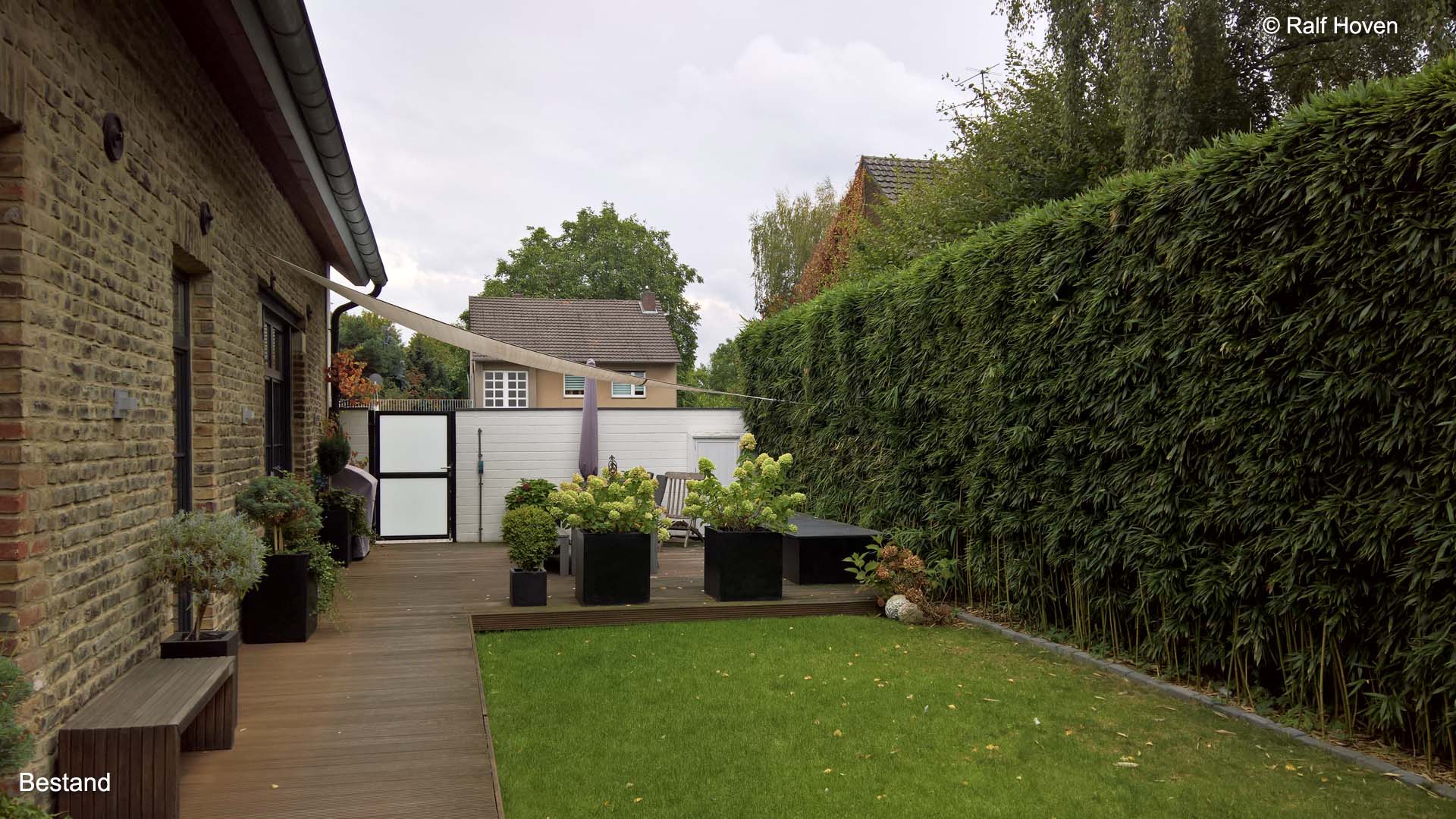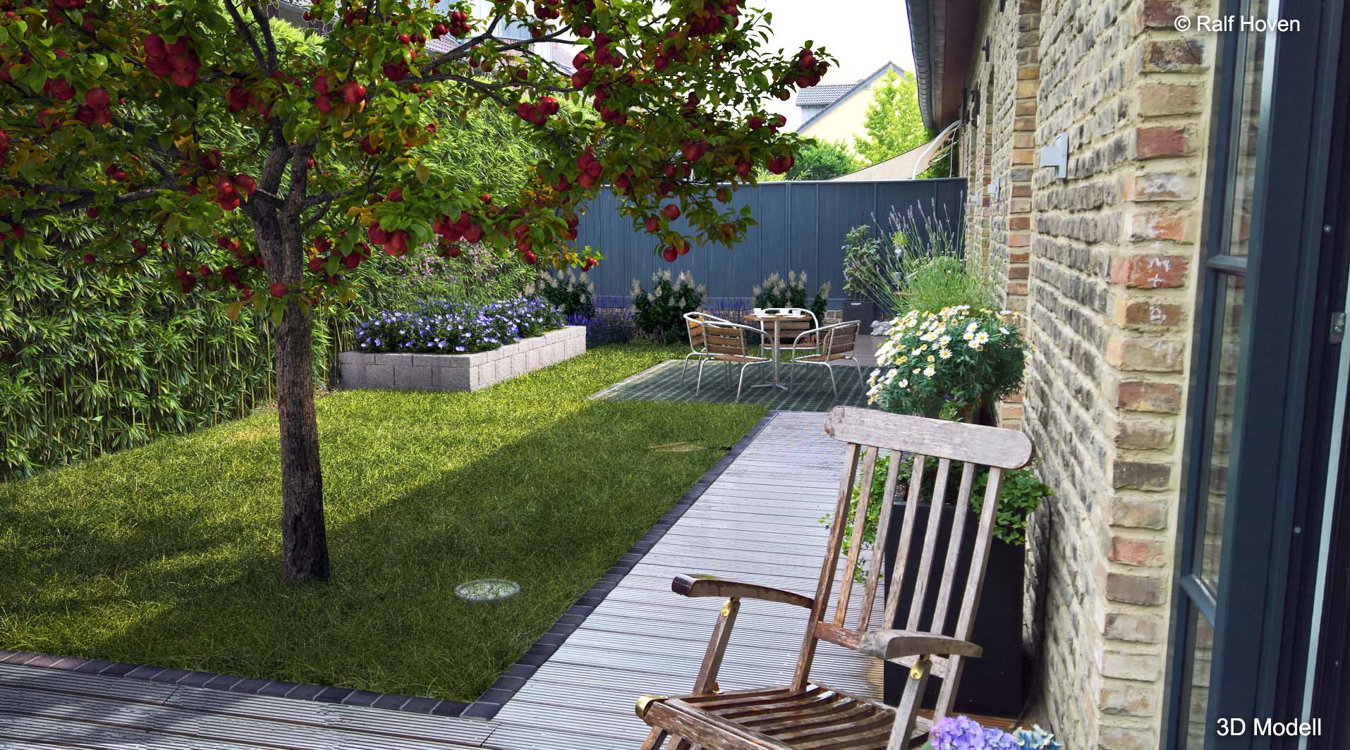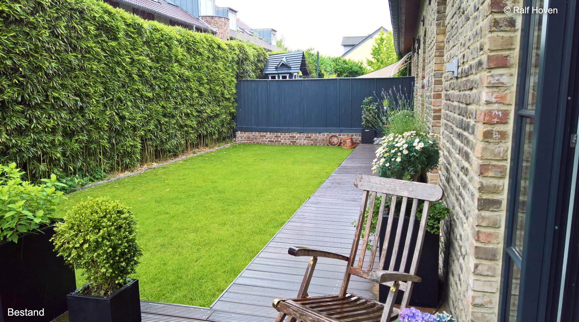 In Pulheim haben wir einen Innenhofgarten stellenweise umgestaltet. Unser Ziel war es eine gemütliche und intime Atmosphäre zu schaffen. Der Kleinbaum im Rasen dient als Sichtschutz zum dahinter liegenden Nachbarhaus und zugleich als Blickfang