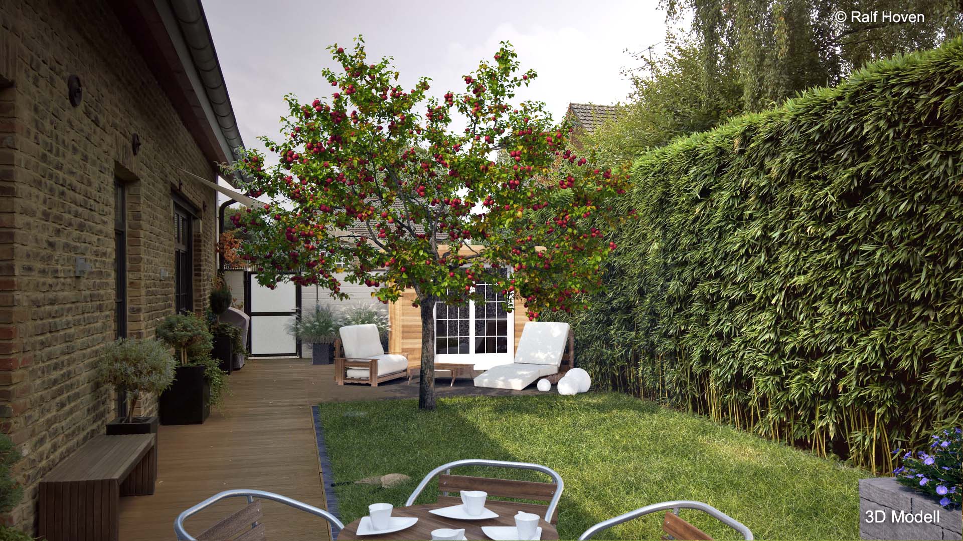 mit seiner tollen Blüte und den Früchten. Auf der anderen Seite des haben wir eine kleine Terrasse ergänzt, die zu kurzen Verschnaufpausen und entspannten Momenten im